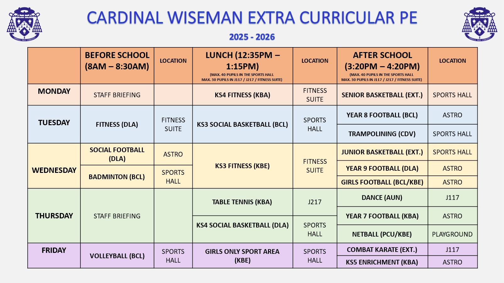 TIMETABLE FOR EXTRACURRICULAR CLUBS AND ACTIVITIES 2025-2026